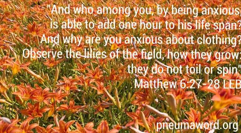 “And who among you, by being anxious, is able to add one hour to his life span? And why are you anxious about clothing? Observe the lilies of the field, how they grow: they do not toil or spin, but I say to you that not even Solomon in all his glory was dressed like one of these. Matthew 6:27-29 LEB