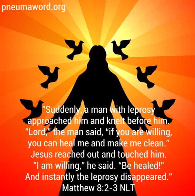“Large crowds followed Jesus as he came down the mountainside. Suddenly, a man with leprosy approached him and knelt before him. “Lord,” the man said, “if you are willing, you can heal me and make me clean.” Jesus reached out and touched him. I am willing,” he said. Be healed! And instantly the leprosy disappeared.” Matthew 8:1-3 NLT
