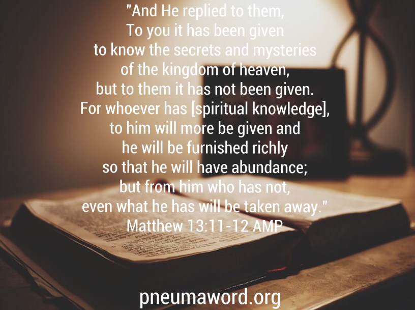 “And He replied to them, To you it has been given to know the secrets and mysteries of the kingdom of heaven, but to them it has not been given. For whoever has [spiritual knowledge], to him will more be given and he will be furnished richly so that he will have abundance; but from him who has not, even what he has will be taken away.” Matthew 13:11-12 AMPC